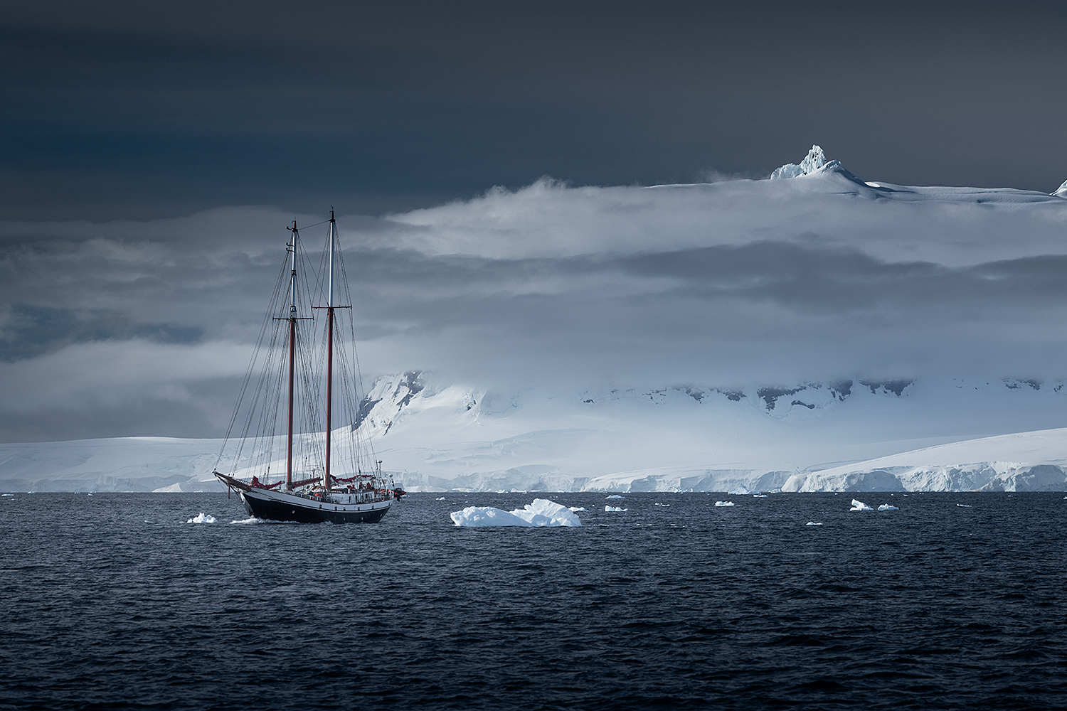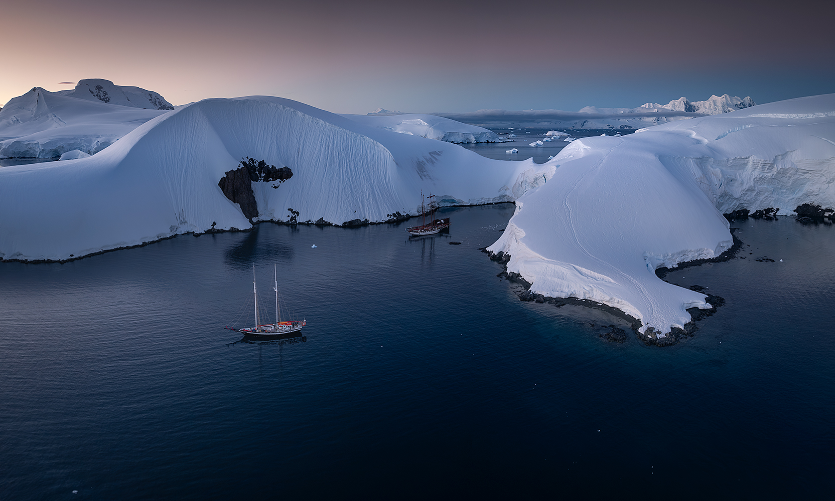 O świcie zrobiłyśmy już serio ostatnią sesję Red Sails – na zatoce otoczonej szczytami gór, wśród pływających gór lodowych i lodu w postaci brash ice – drobnej pokruszonej kry unoszącej się na powierzchni. Tu ostatni raz odpaliłem drona, znów modląc się, aby udało się bez kłopotu wylądować. Widok zarówno z dołu jak i z góry jest cudowny, bo sceneria tutejszych gór jest absolutnie poza skalą. Fotografowaliśmy dobrą godzinę albo dłużej, jednak tuż po wschodzie zerwał się wiatr, wobec czego załoga szybko zaczęła zwijać żagle i był to oficjalny koniec sesji zdjęciowej żaglowców. Po tym poranku rozpoczęliśmy powrót w kierunku Szetlandów Południowych. Tego dnia płynęliśmy przez cały dzień i całą noc, aby przekroczyć Cieśninę Bransfielda, korzystając z tego, że woda jest spokojna, a pogoda prawie perfekcyjna. Fala była bardzo niska dzięki czemu przepłynęliśmy ten odcinek bez objawów choroby morskiej, a trochę się o to martwiliśmy.