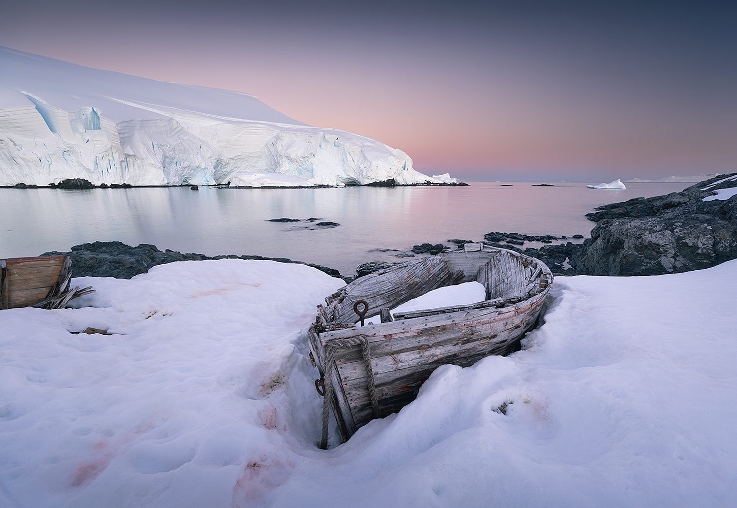 Nocą dopłynęliśmy do zatoki u wybrzeża Enterprise Island, gdzie znajdują się wraki statków i łodzi wielorybników. Wstajemy jeszcze przed wschodem o godzinie 1.20. Trwa właśnie piękna niebieska godzina, więc jest to doskonały czas na zdjęcia. Tutejsze skaliste wyspy niemal w całości są przykryte lodowcami, nawet te bardzo małe. Na jednej z nich leżą przysypane śniegiem 2 drewniane lodzie, które fotografujemy. Latamy tu również dronami, krajobraz jest bardzo surowy i pełen lodowego piękna. Około 3 wschodzi słońce, które bardzo powoli wyłania się zza horyzontu i oświetla najpierw jedynie czubki gór.