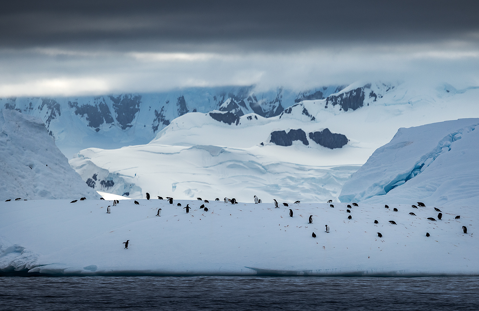 Drugi rejs robimy po obiedzie i podpływamy do ogromnego lodowca, który cieli się w wodzie. Jego ogromne potrzaskane ściany robią wielkie wrażenie na nas i spędzamy tu naprawdę mnóstwo czasu. W mrocznej mglisto zachmurzonej scenerii fotografujemy ogromne ściany lodowe odbijające się w spokojnej tafli wody i poszukujemy ciekawe icebergi na pierwszy plan. Na koniec płyniemy jeszcze raz na kry z fokami, które wciąż leżą w takiej pozycji jak kilka godzin wcześniej. Fotografujemy praktycznie cały czas z poruszającej się łodzi, nie używamy w ogóle statywów. Przez cały wyjazd, dotąd użyłem statywu tylko jeden raz. Wieczorem, już po kolacji wyruszamy w kierunku Port Lockroy, gdzie mamy kilka godzin drogi.