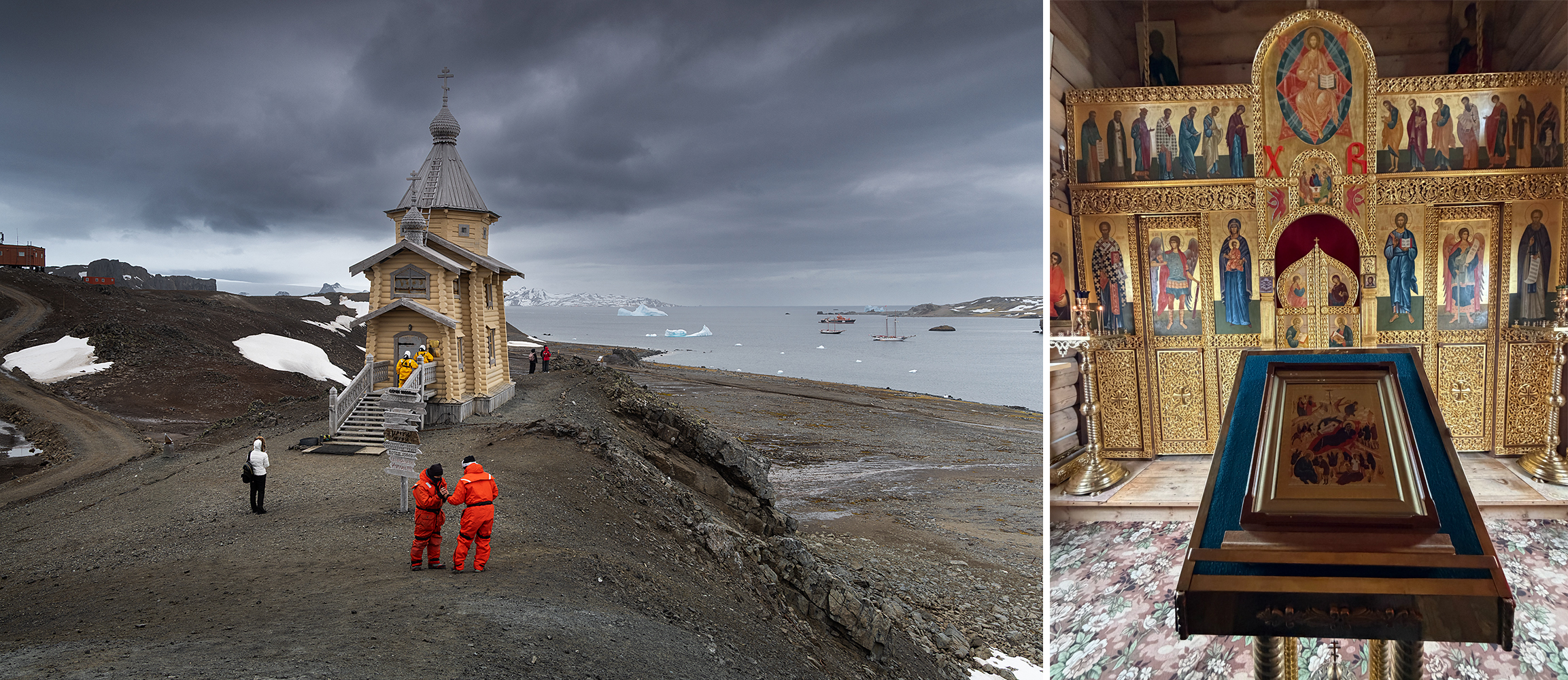 Na miejscu nasze grupy zostały podzielone na dwa jachty: Elsi i Tolkien. Bagaże są rozdzielane już na lotnisku w Punta Arenas, gdzie te, które pojadą na Elsi zostają oznaczone kolorowymi etykietami, dzięki czemu łatwo je później przydzielić na odpowiedni jacht. Generalnie tego pierwszego dnia w Bellingshausen mieliśmy kilka godzin przestoju, który wynika z potrzeby przewiezienia bagażu na jacht i ogarnięcia jakichś innych spraw organizacyjnych. W tym czasie odwiedziliśmy rosyjską Cerkiew Świętej Trójcy, która góruje nad stacją badawczą na niewielkim wzgórzu i pooglądaliśmy pingwiny skaczące do wody z dryfujących przy brzegu gór lodowych. Poznajemy też członków naszej załogi na Elsi: Kapitana Andrieja, przewodniczkę Marinę (prywatnie żonę kapitana), first mate Aleksieja, Kucharza Borisa i jeszcze dwóch facetów, których imion nie pamiętam. Okazuje się, że wszyscy są Rosjanami. Daniel Kordan jest Rosjaninem, to wiedzieliśmy, ale na miejscu okazało się, że organizuje wyjazd ze swoją załogą, która w całości składa się z Rosjan.