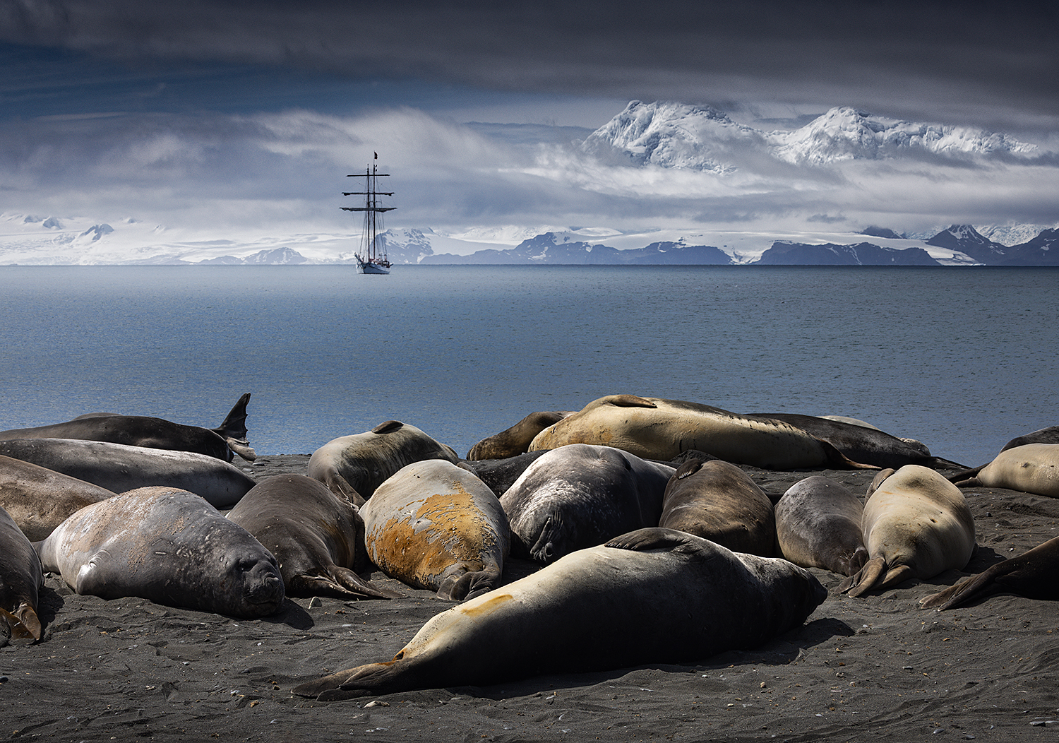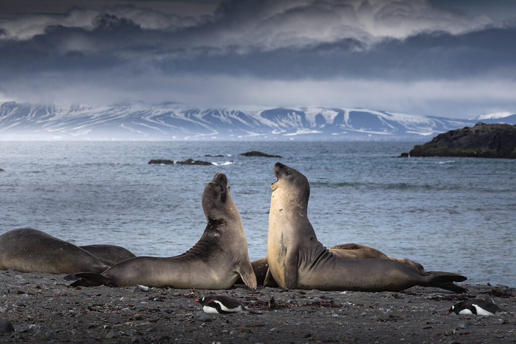 Słoń morski to największy przedstawiciel gatunku fok na świecie, który regularnie korzysta z plaż na wyspie do odpoczynku i linienia. Samce mogą osiągać rozmiary nawet do 5-6 metrów długości, mają charakterystyczny trąbopodobny nos oraz są znacznie większe od samic. Dorosłe osobniki mogą ważyć nawet 4 tony (to tyle co 8 koni!). To był bardzo interesujący plener, szczególnie gdy na kilka minut odsłoniły się białe góry Tangra na horyzoncie. Przez około 2 godziny fotografowaliśmy zwierzęta na tle surowego krajobrazu, choć były tu głównie skały i piach, a śnieg i lód jedynie daleko na horyzoncie. Foki wylegiwały się na piachu, ale czasem dochodziło też do walk i były to najbardziej interesujące momenty do fotografowania.